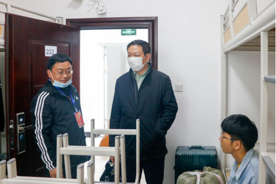 下午5点,夜幕降临,学校纪委书记骆最勇老师和商贸学院党总支书记张杰老师走进宿舍看望孩子们:摸一摸被子有没有淋湿、带的衣服够不够、厚不厚,更是勉励大家谨记习近平总书记对青年的谆谆教诲,在大学期间,踏实求学,编织梦想,放飞青春。