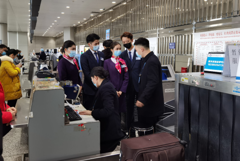 筑梦,在校企合作新模式下,航投航空学院把课堂“搬”进企业,带领同学们走进贵阳龙洞堡国际机场和多彩贵州航空公司客舱服务部。第一站机场航站楼,顾客服务中心经理邓力带领大家参观并为大家介绍了机场问询、客票服务、值机服务、行李托运、大件行李托运安全检查、防爆检查等机场地面服务的流程,理论知识与实践工作场景的结合,使同学们对民航地面服务生产流水线有了更直观的认识和理解。
