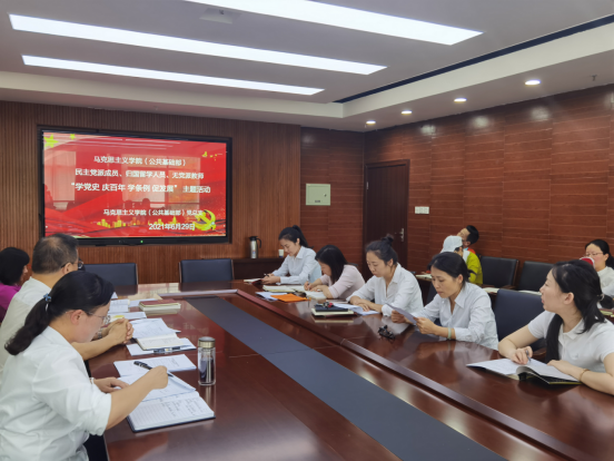 为热烈庆祝中国共产党成立100周年,扎实抓好党史学习教育,深入贯彻习近平新时代中国特色社会主义思想,全面落实习近平总书记关于加强和改进统一战线工作的重要思想和视察贵州重要讲话指示精神。2021年6月29日,马克思主义学院(公共基础部)开展民主党派成员、归国留学人员、无党派教师“学党史 庆百年 学条例 促发展”主题活动。