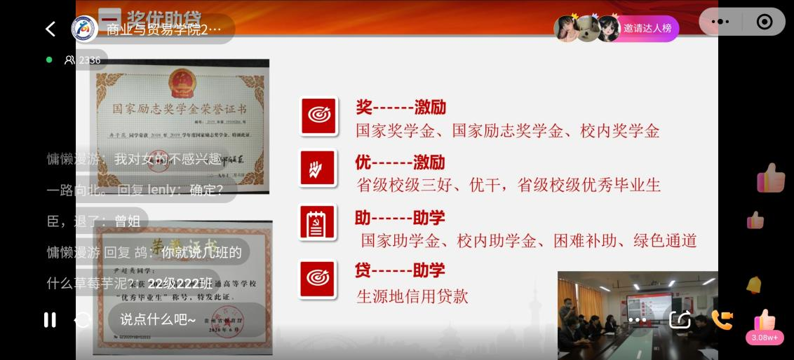 辅办主任朱凯介绍了奖学金、助学金、助学贷款、评优评奖等同学们关心的话题,同时也对贫困认定、建档立卡补助、退役复学学费代偿等相关事宜给同学们做了详细介绍。